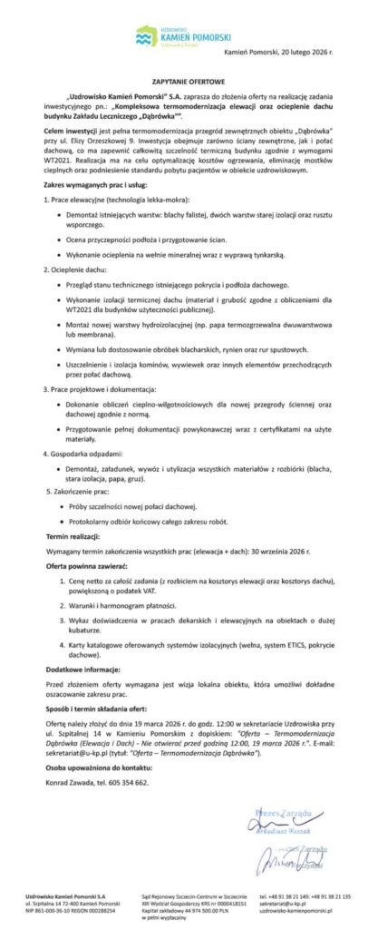 „Uzdrowisko Kamień Pomorski” S.A. zaprasza do złożenia oferty na realizację zadania inwestycyjnego pn.: „Kompleksowa termomodernizacja elewacji oraz ocieplenie dachu budynku Zakładu Leczniczego „Dąbrówka””.