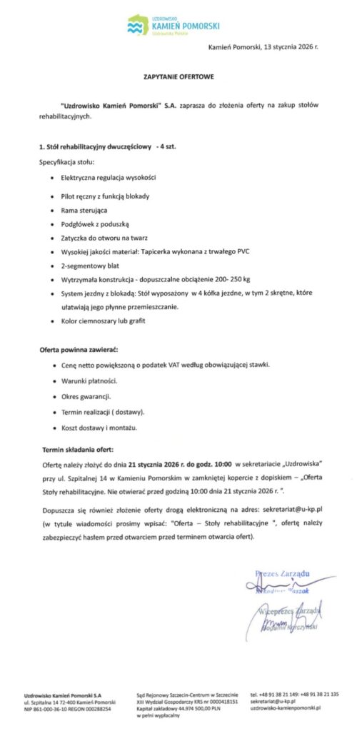„Uzdrowisko Kamień Pomorski” S.A. zaprasza do złożenia oferty na zakup stołów rehabilitacyjnych.